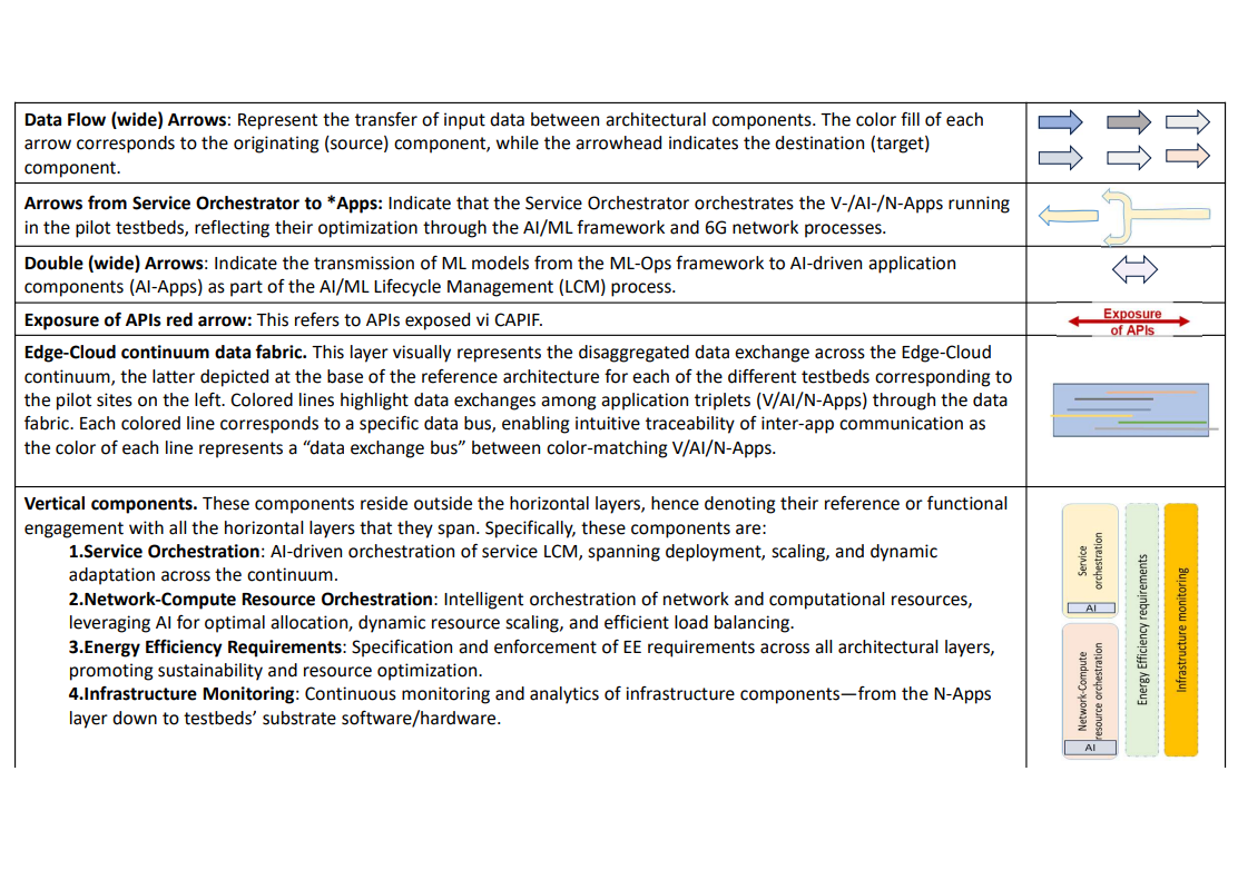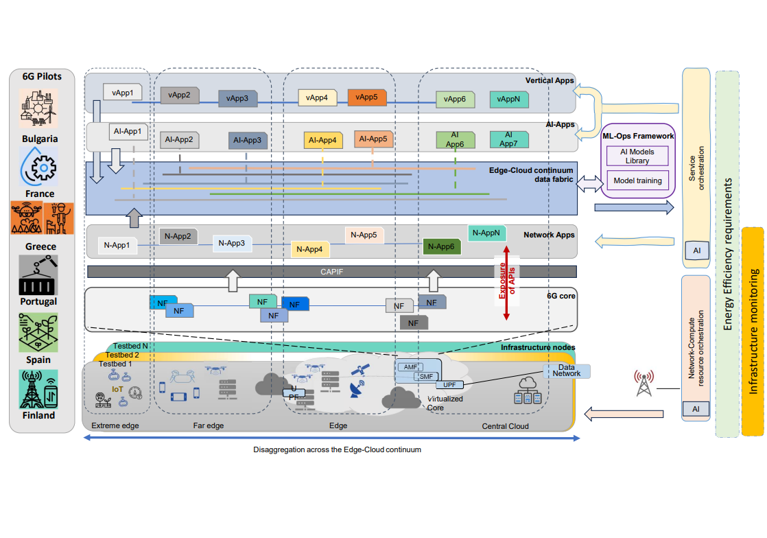 The 6G-VERSUS reference architecture presented here is designed as a layered and modular framework, supporting the transformation of conventional applications into 6G-native services while ensuring programmability, AI-driven intelligence, and energy efficiency. It is important to clarify that the term reference architecture denotes a common architectural foundation that each testbed will adopt and adapt in accordance with the specific requirements of its local UC(s). This approach provides an architectural coherence across the project while allowing the necessary flexibility in implementation based on testbed capabilities, vertical demands, and deployment conditions. The architecture itself promotes modularity, interoperability, and integration of AI across layers, enabling intent-based operations where verticals define service objectives—such as energy efficiency or latency targets—and the system dynamically reconfigures available resources to meet them. Interfaces are exposed for real-time and workload-aware allocation of compute, storage, and network assets, allowing for efficient orchestration tailored to each trial environment.